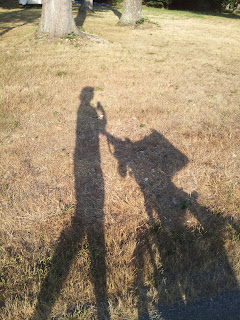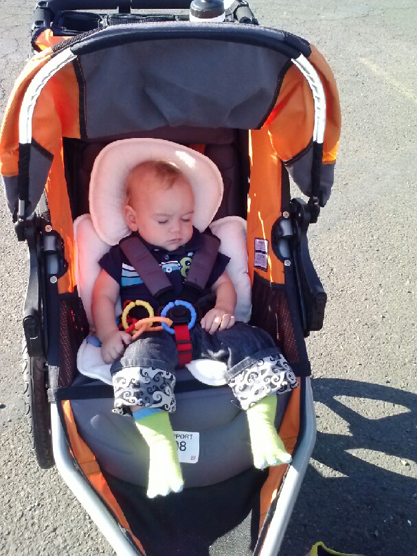 Before the race we figured Super Awesome Wife would watch the swim, then get in the car with the boy and drive to T2 to see me off on the bike and at the finish. But then we talked to the race director and asked if I could run with the B.O.B. and the boy. She said sure, no problem. Yay! Baby's first triathlon! His fourth race overall. This kid can't stop doing races. So T1 was cap and goggles off, shoes, visor, and watch on, kiss wife, check boy (she put him in while I was swimming), and away I go with the stroller. Fun fun!