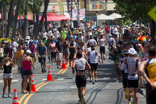 I grabbed a quick warm-up before the safety brief to try out the water and get everything loose. There was no time for me to warm-up before Ko'Olina and I felt it big time during the first two lagoons and I wasn't about to let that happen again. The swim course was technically open water, but really it was inside K-Bay. Which meant no waves or real current to deal with, but a strange and occasionally pointy man-made bottom on the entry and exit. Being next to an airfield, it probably also meant swimming through leaked fuel, but we aren't going to think about that.